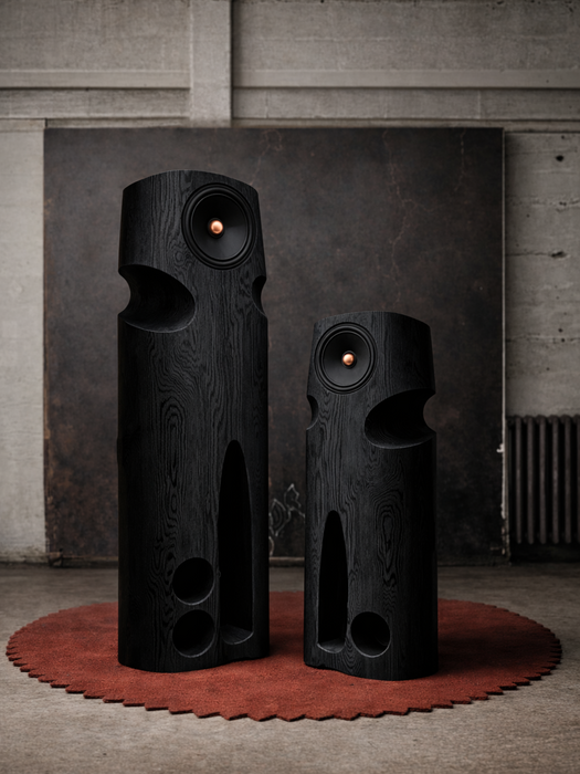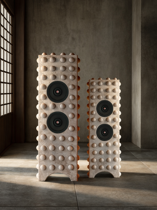 A single monolithic tower that anchors a room the way an artifact from another age would. Eight drivers are embedded within the form, projecting outward in all directions. The listener is no longer in front of the sound. They are inside it.